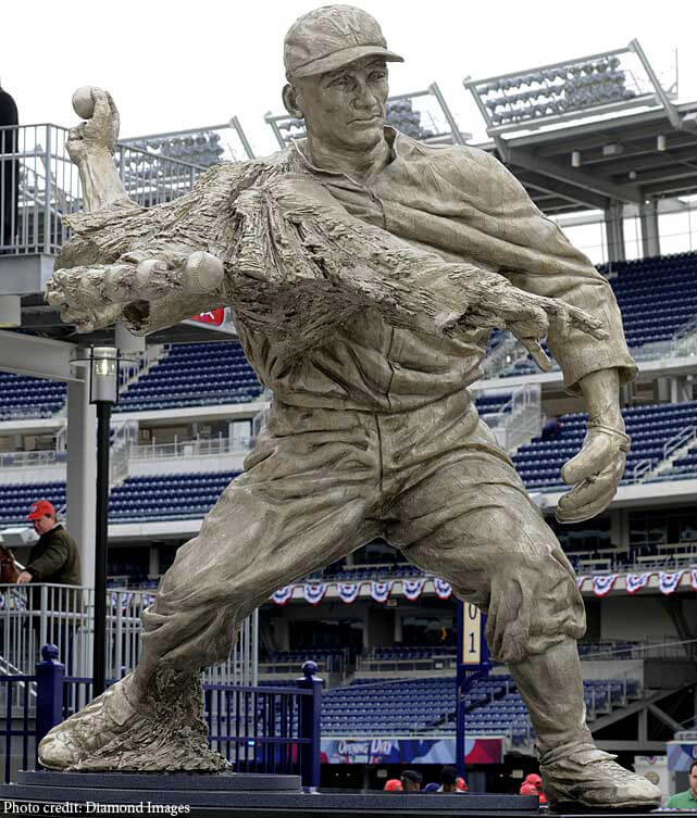 Walter ‘The Big Train” Johnson is still considered one of the best pitchers in all of baseball history. He was elected to the Baseball Hall of Fame in 1936. In this unconventional approach to sports statues, Walter Johnson is captured as a motion in time. Artist Omri Amrany describes it as conveying the fourth dimension in art. The ‘Johnson Pitch’ is portrayed as a larger than life 8-foot tall bronze figure. He stands alongside Frank Howard and Josh Gibson in the Center Field Plaza at Nationals Park in Washington, DC.